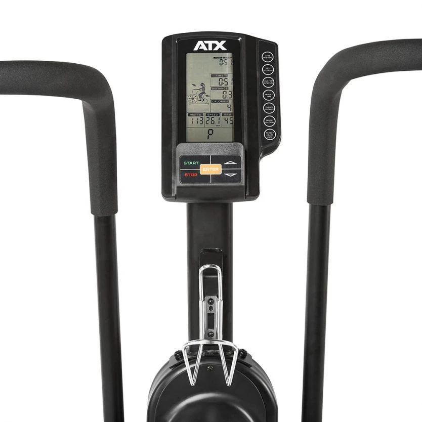 The ATX air power bike is a HIIT bike that uses air resistance to increase the input effort. The bike can work both lower and upper body at the same time to make the over all work you harder. The air bike is great for increasing your overall health as well as you cardio and endurance. the Bike has a robust tubular steel construction with extra stable articulated axles. The foot pedals and arms are forged steel with high-quality ball-bearings for a smooth operation. It has a low noise chain belt drive. The seat can be adjusted both horizontally and vertically. Comes with a console / LCD monitor that is independent of mains power / battery operation (Delivery including battery) with a display of: total time, time, distance, calories, watts, pulse.