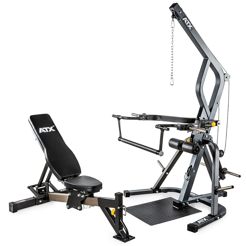 A fairly compact multigym, given what’s on offer. In short, it’s ATX’s ever-popular column adjustable bench and multipress combination, coupled with a bar attachment for the multipress arms (for things like squats) and a lat pulldown and mid-row pulley. Clear dimensions can be found among the images.