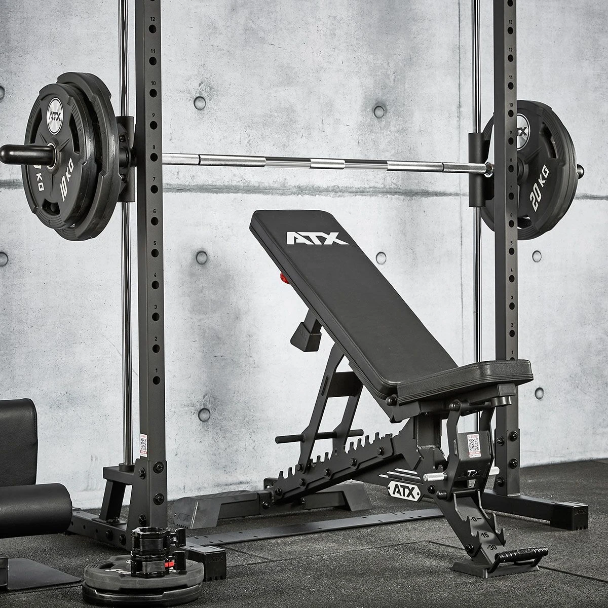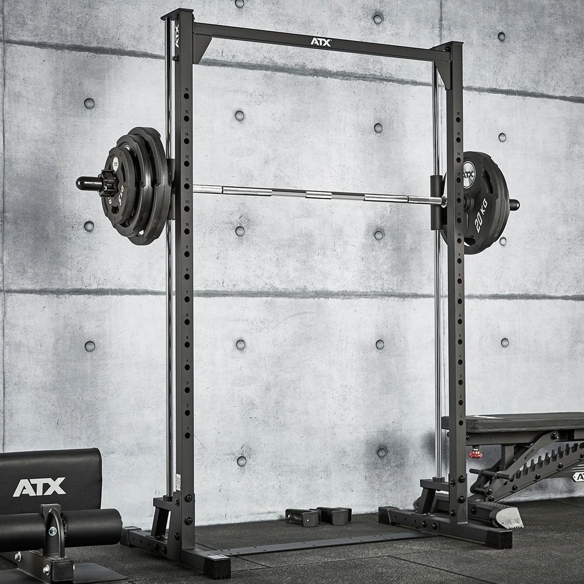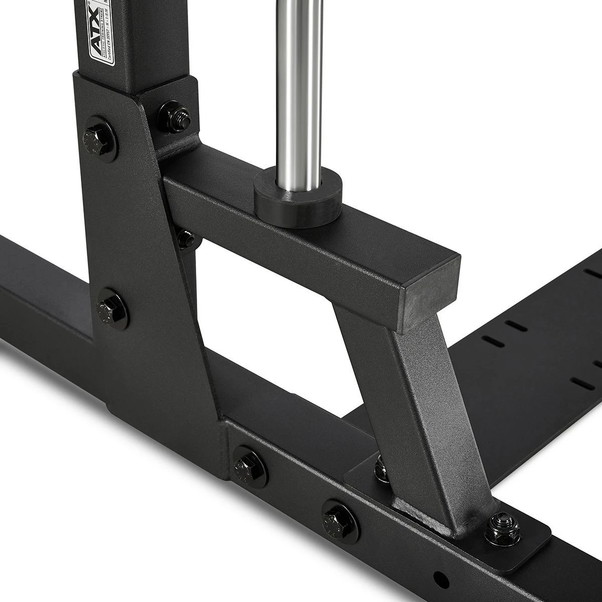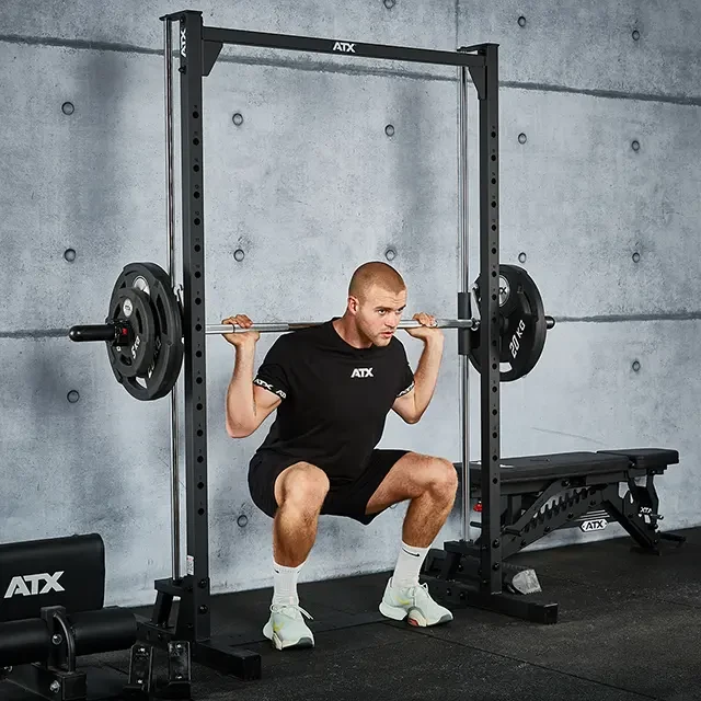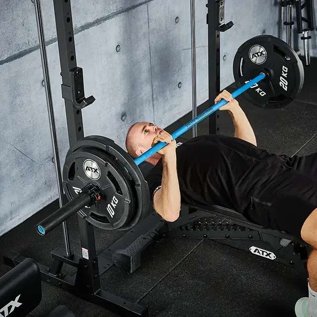 This ATX Smith Machine MPX-500 has an extra low construction with a height of only 198 cm. This makes this rack ideal for low spaces, such as in the basement or attic. The integrated Smith barbell can be hooked in at multiple heights, making it safer to train alone. The barbell is made of solid steel and has knurling for a good grip. The barbell moves smoothly up and down on the guide bars thanks to the linear ball bearings. J-hooks for training with a separate barbell at the front of the rack are optionally available (spotter arms are not available for this model). This smith machine has a load capacity of up to 200 kg and is certified to the European safety standard EN 20957 I.II.IV Class H for home use.