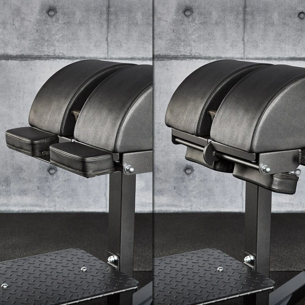 Another highlight is the fold-out knee support, which can be easily folded out / in if necessary, this increases the security if necessary – especially for beginners – considerably! The tapered opening between the upholstery rolls always ensures the ideal fit for different ankle / foot sizes, the upholstery height can be individually adjusted quickly and easily thanks to the slide-lock system. The width adjustment of the device offers perfect handling! – This can be operated directly from the training start starting position. By operating the hand lever, the support plate can be fixed easily and directly to the ideal position, thus ensuring maximum comfort and perfect adjustment.