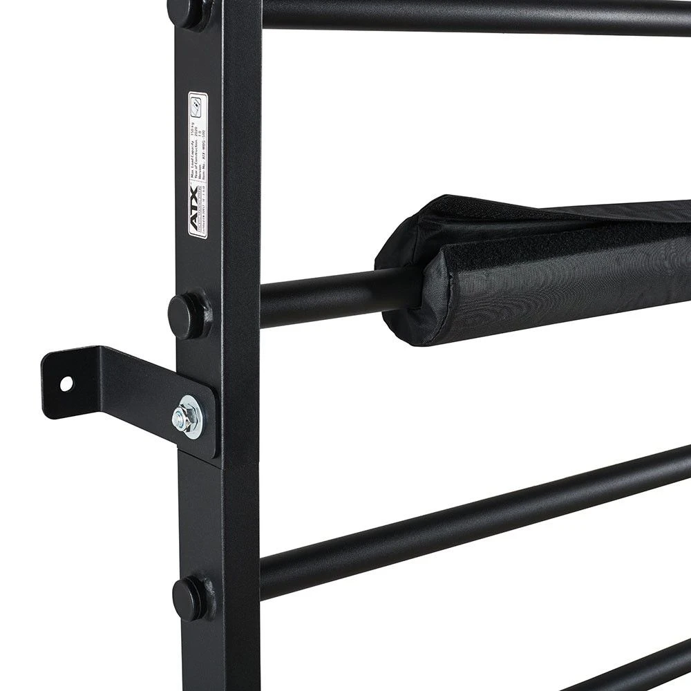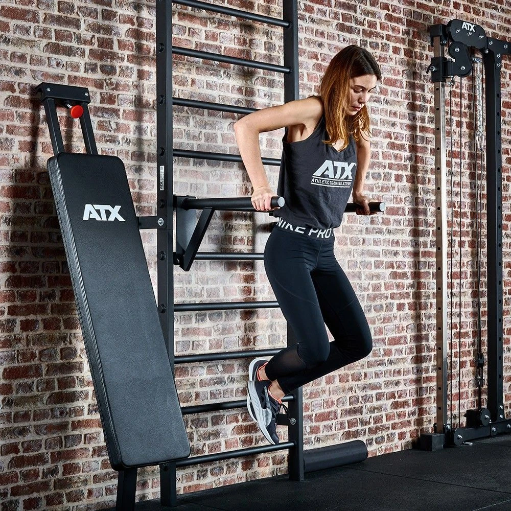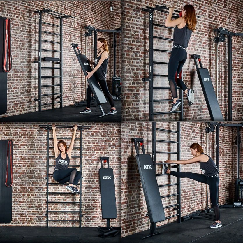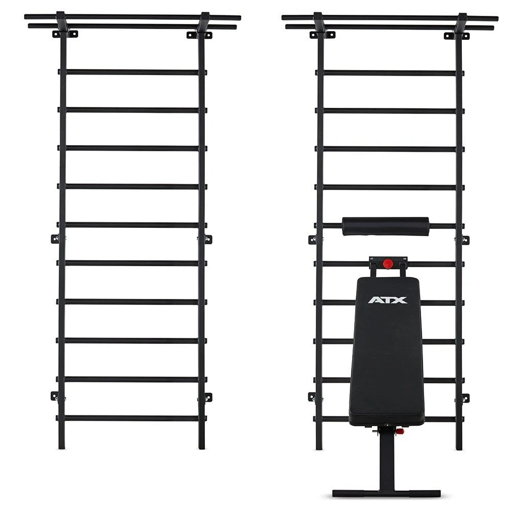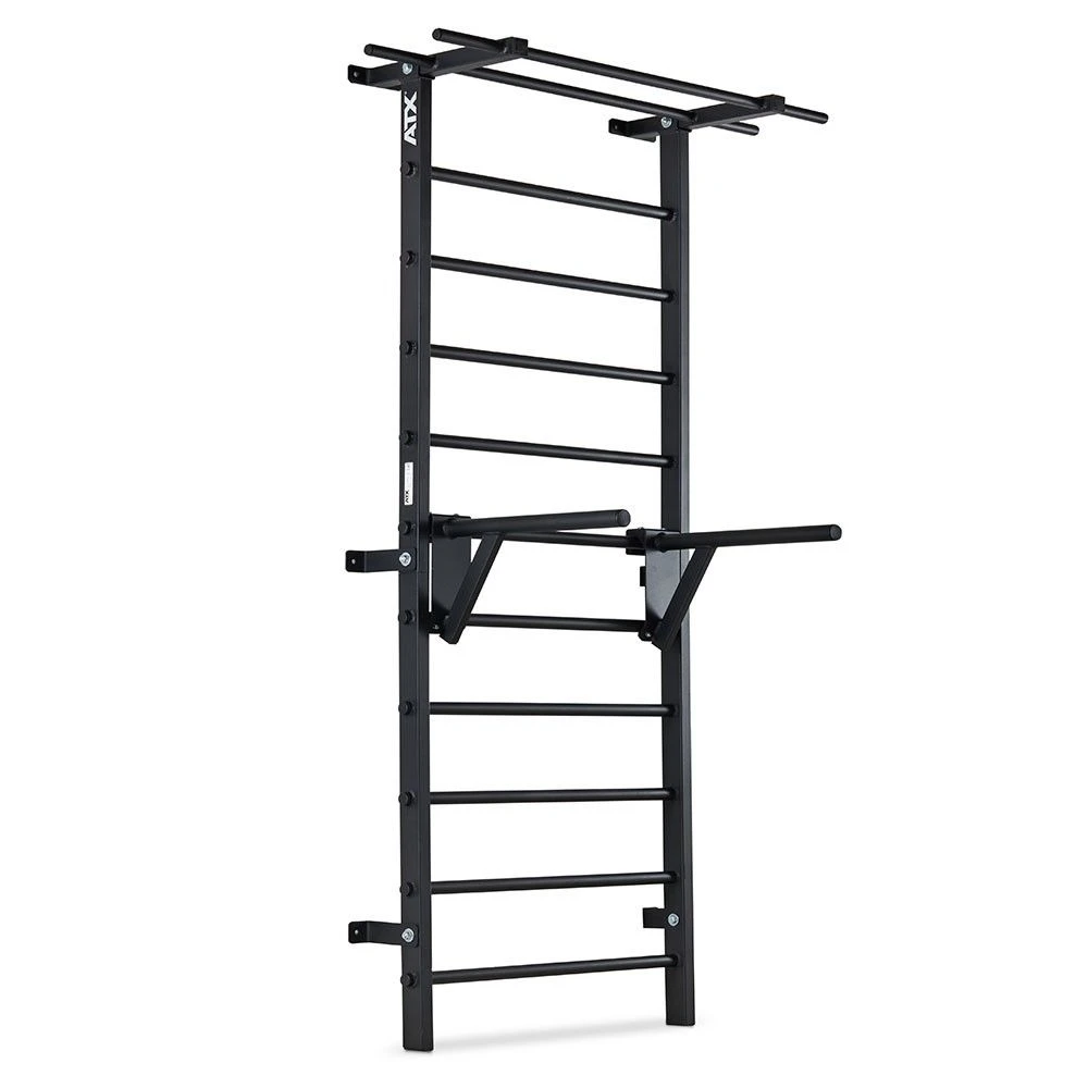 The swiss wall bars gym unit comes with an adjustable bench that can be and be fitted to the rungs at a number of angles for a variety of exercises. A pull-up bar is fixed at the top of the wall bars. Attachable dip bars and cushion (barbell-style) pad are also included.