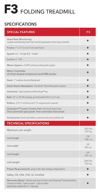 LIFE FITNESS F3 FOLDING TREADMILL SPECIFICATION: