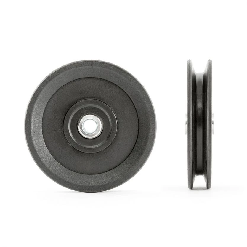 The 115mm pulley has a load capacity of 160kg. It has a closed ball bearing system and is made of shatter proof plastic. The centre hole is 10.5mm and the pulley can hold up to a 8mm cable. Fits all ATX equipment where applicable