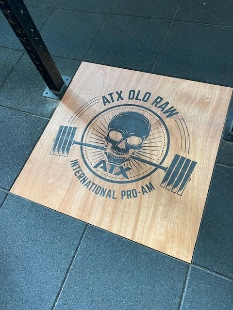 Our own facility, @thegym, has many recessed platforms (platform inserts) and standalone platforms. We were often asked about the recessed platforms and have done them on jobs many times before and since; they are usually plywood cut-to-size and a choice of vinyl graphic, laser-burnt, or laser-printed. We have a mix of these in our own facility. Our preference is laser-burnt, as we can do this inhouse, as per the ATX OLO RAW example.